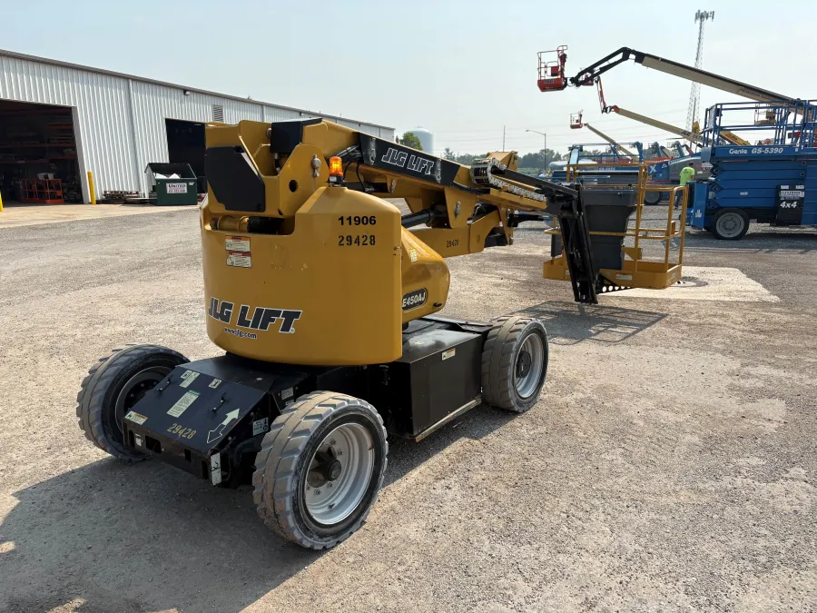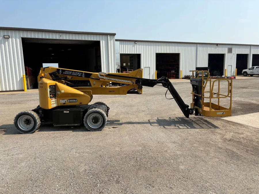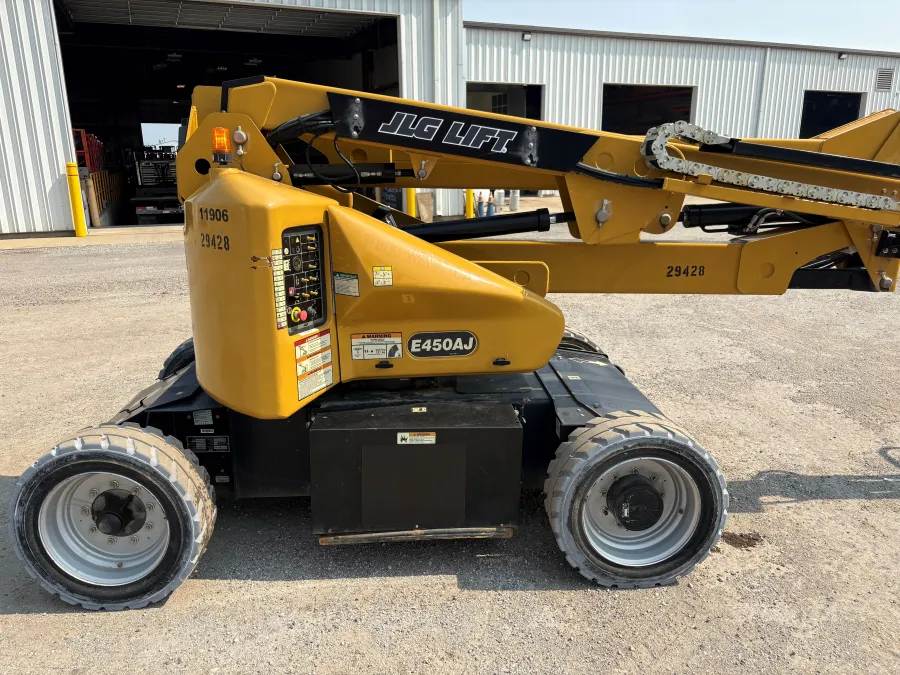 JLG E450AJ electric articulating boom lift. Features include: 45′ platform height, and 500 lb lifting capacity.