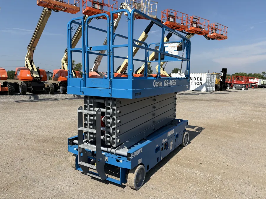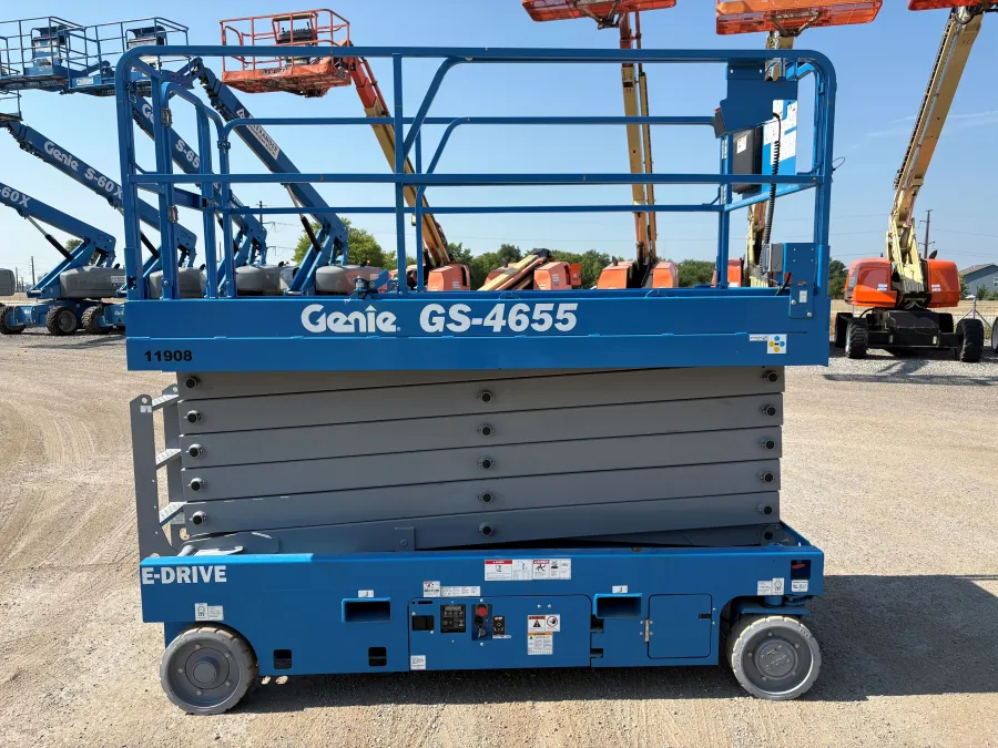 For sale: 2023 Genie GS4655 electric scissor lift. Features include: 46 ft platform height, extension deck and non-marking tires.