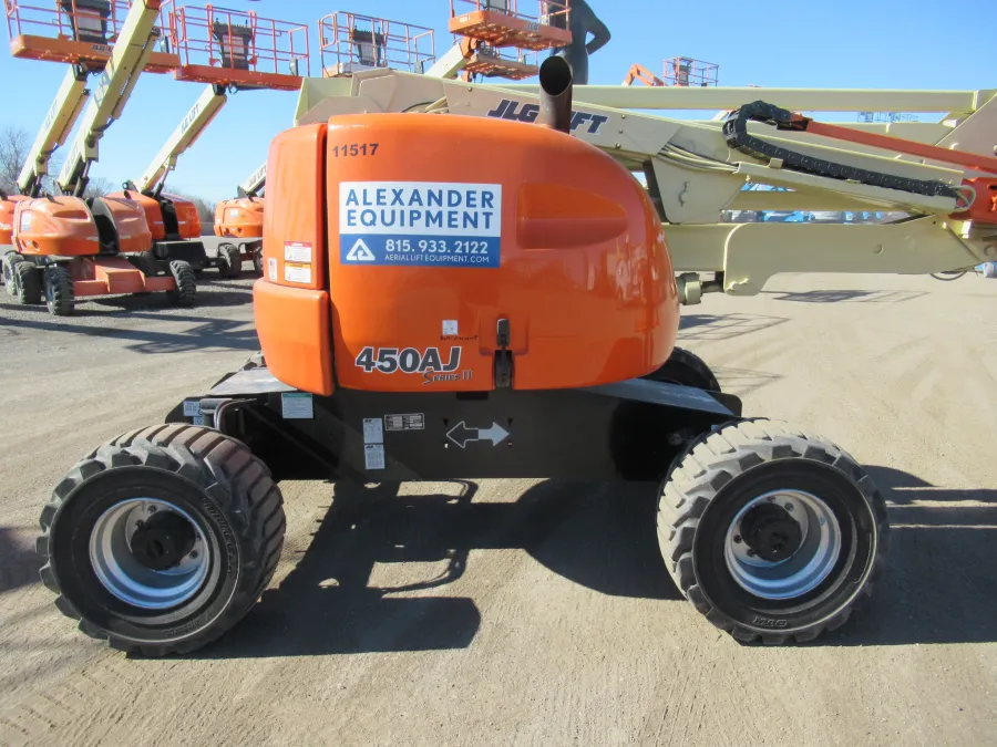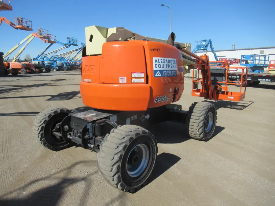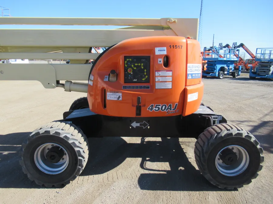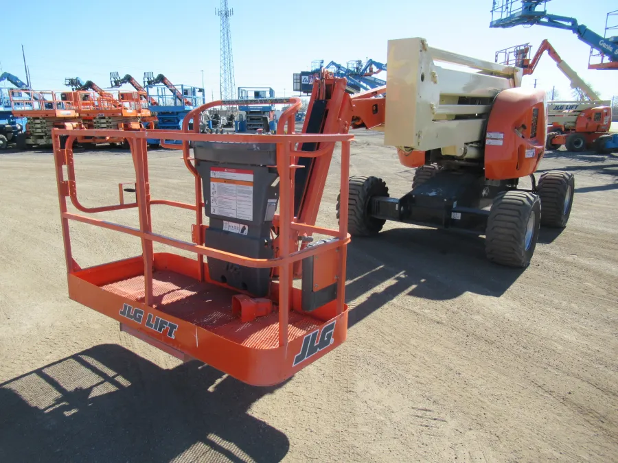 JLG 450AJ articulating boom lift. Features include: 45′ platform height, jib, diesel power, and 4 WD.