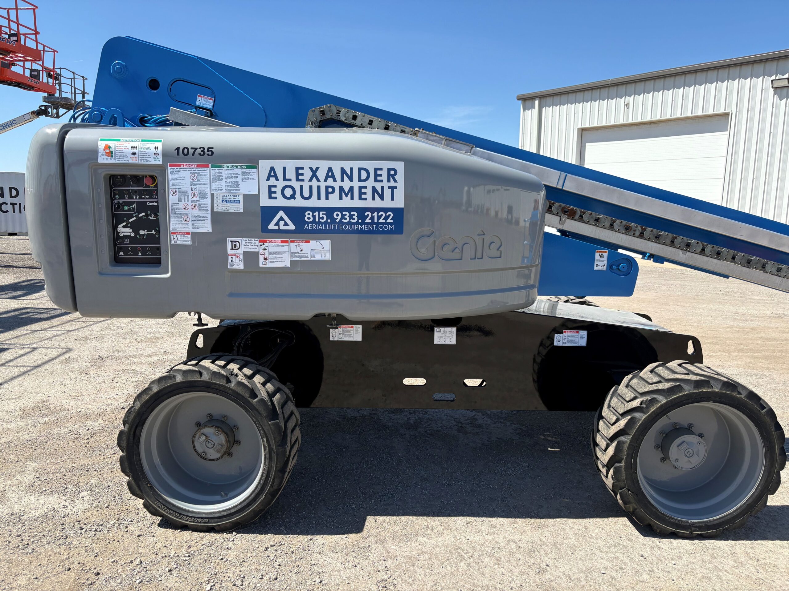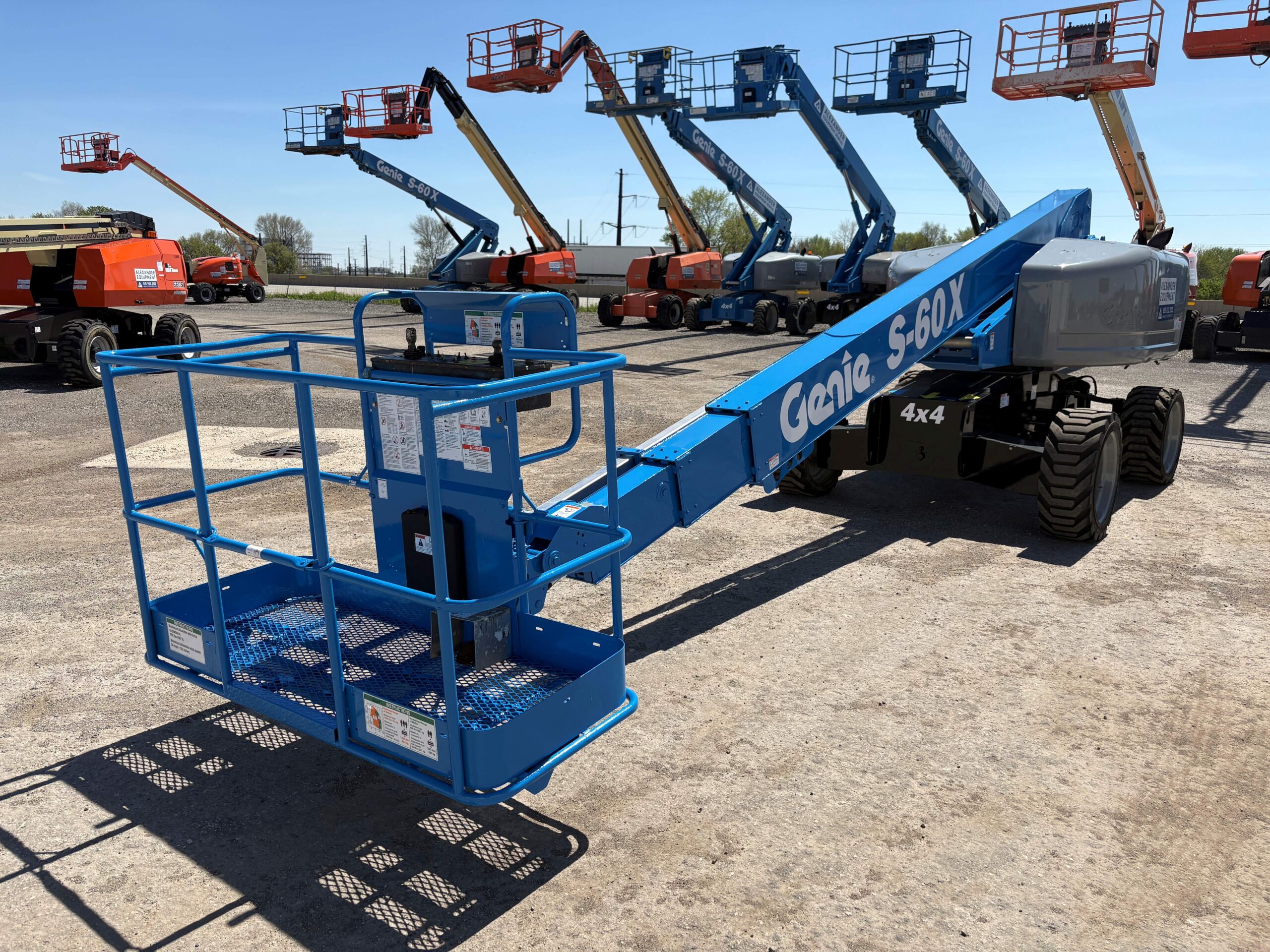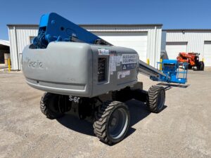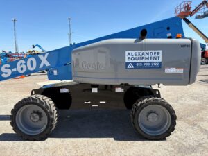 Genie S-60X telescopic boom lift. Features include: extra platform lifting capacity (500 lb unrestricted and 1,000 lb restricted), 60′ platform height, diesel power and 4 wheel drive.