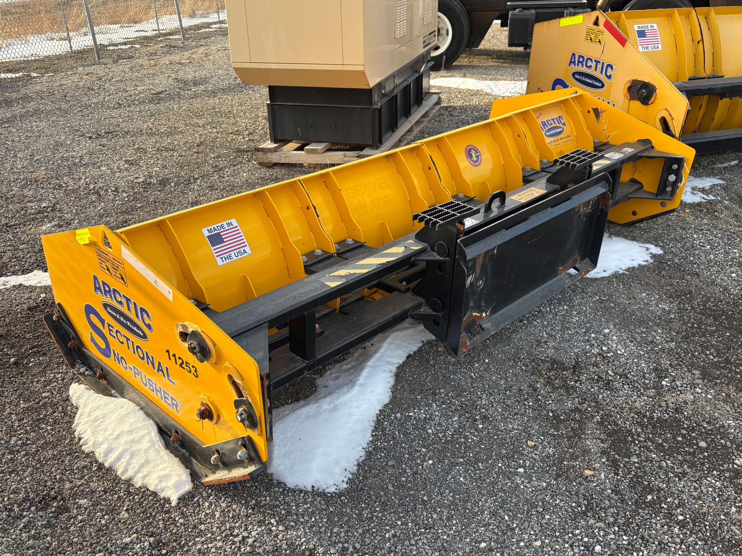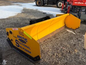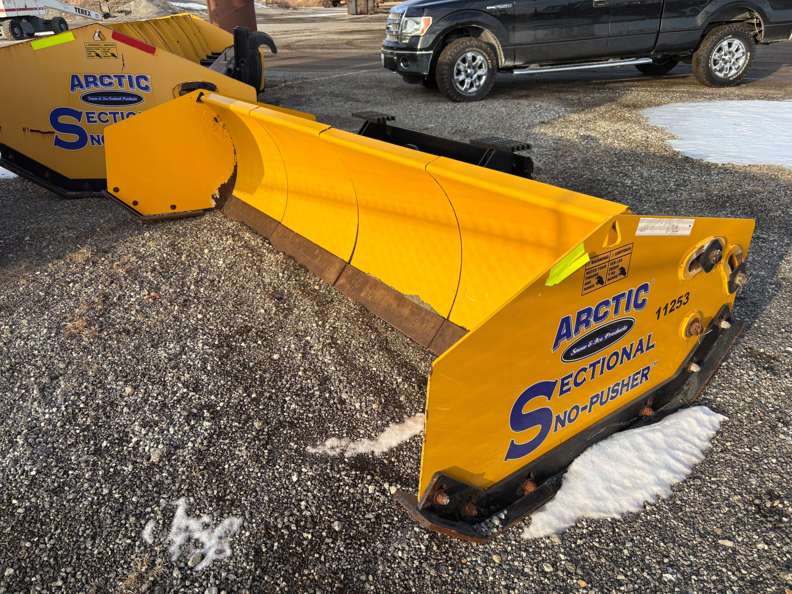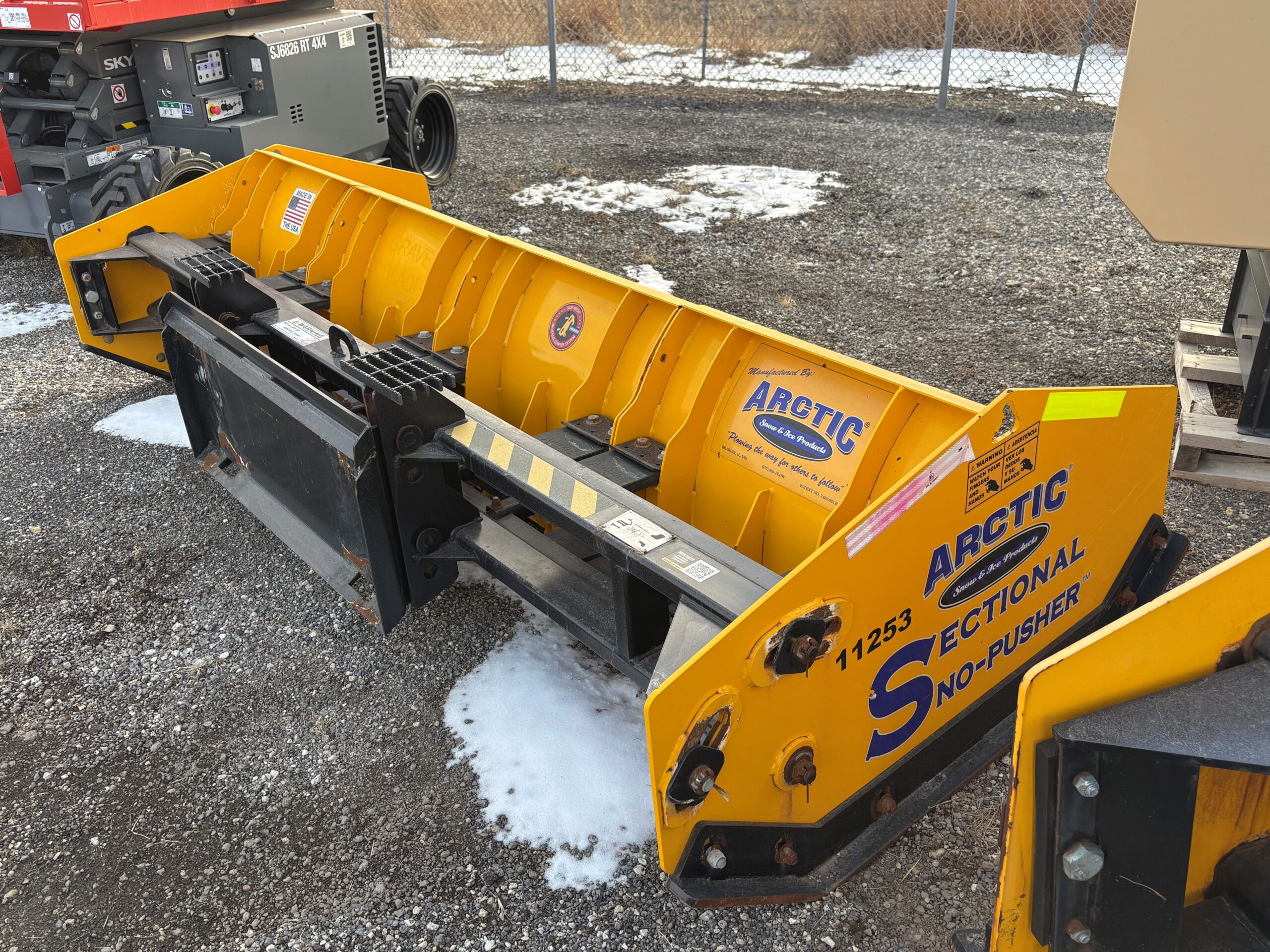This Arctic 10.5LD sectional Sno-Plow/ snow pusher is for sale. 10.5 ft. Compatible with several types of lighter duty equipment including: skid steers, compact loaders, backhoes and tractors. Skid steer bracket included. John Deere 302 coupler available.