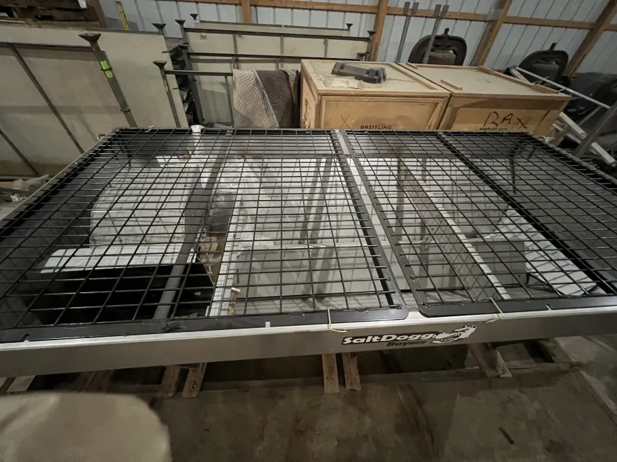 This brand new SaltDogg model 14710F381211, 10ft x 38in, gas powered, chain drive, 304 stainless steel spreader is for sale. Designed for dump bodies and flatbeds with a 13,000 lb GVW minimum. Powered by a 10-1/2 HP Briggs and Stratton Intek industrial / commercial engine with an included battery for electric start. Spreads bulk salt, bulk sand or salt/sand mix. Includes 4 hinged top screens with 1/4″ bars. Made in the USA