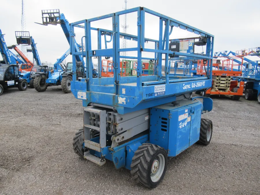 For sale: Genie GS-2669RT rough terrain scissor lift. Features: 26′ platform height, 1500 lb lifting capacity, 4-wheel drive, dual fuel, and extension deck.
