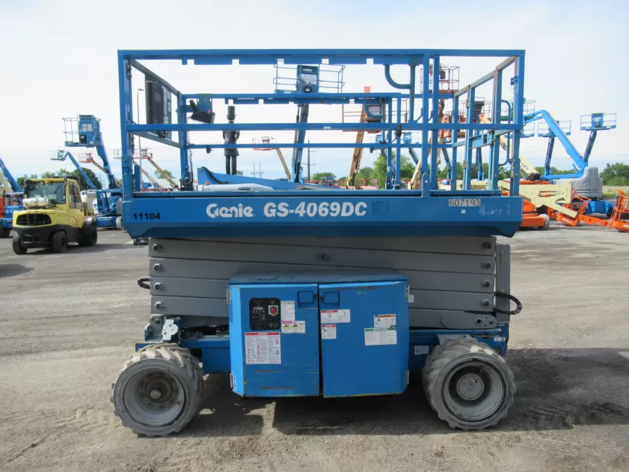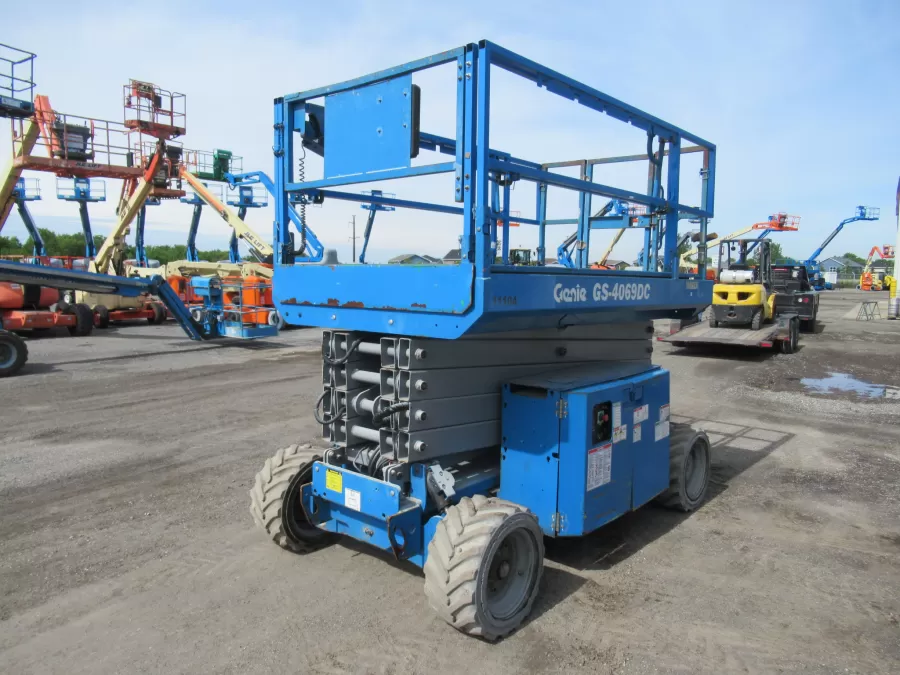Genie GS-4069DC electric rough terrain scissor lift: 40′ platform height, 800 lb lifting capacity, non marking tires and extension deck.
