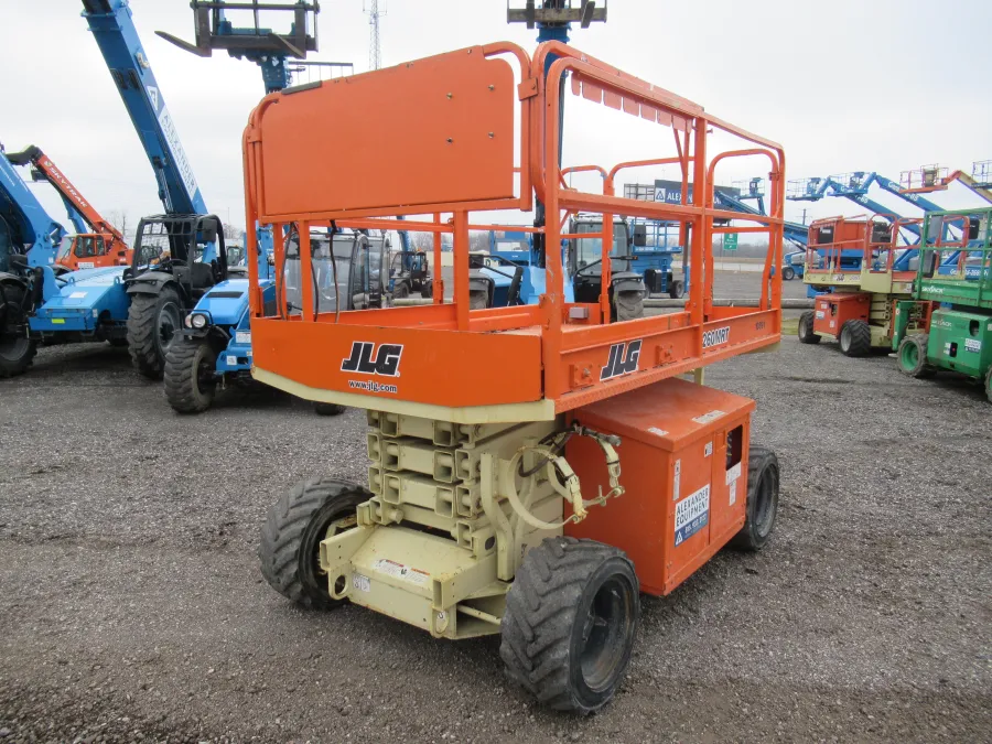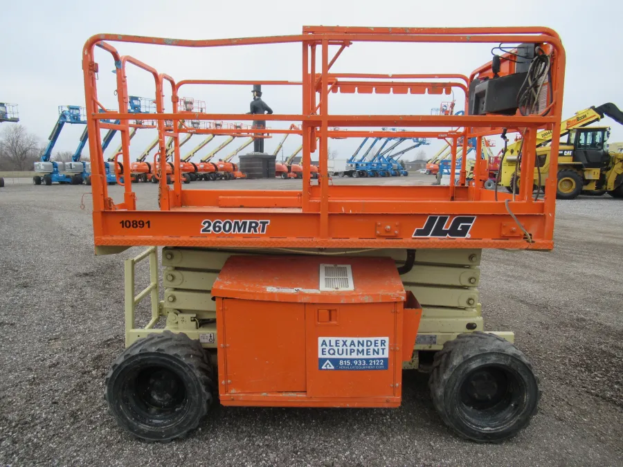This JLG 260MRT rough terrain scissor lift is for sale. Features: 26′ platform height, 1250 lb lifting capacity, 4-wheel drive, dual fuel, and extension deck.