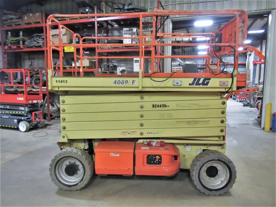 2012 JLG 4069LE electric rough terrain scissor lift for sale. Features: 40′ platform height, 800 lb platform capacity, non-marking tires and extension deck.