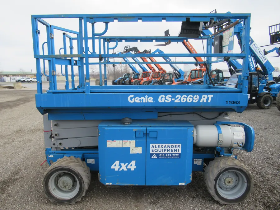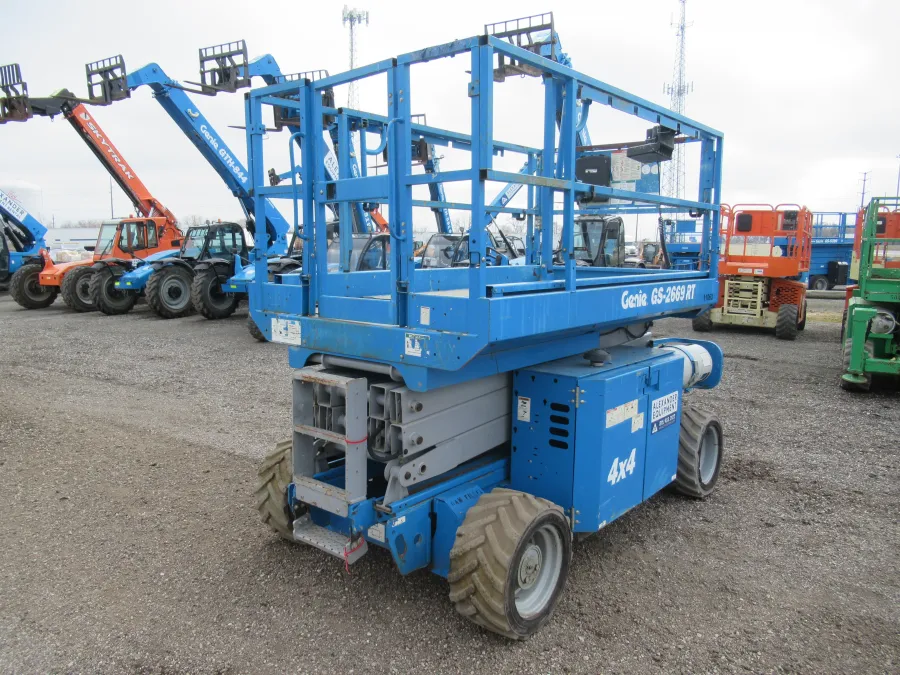 Genie GS-2669RT rough terrain scissor lift. Features: 26′ platform height, 1500 lb lifting capacity, 4 wheel drive, dual fuel, and extension deck.