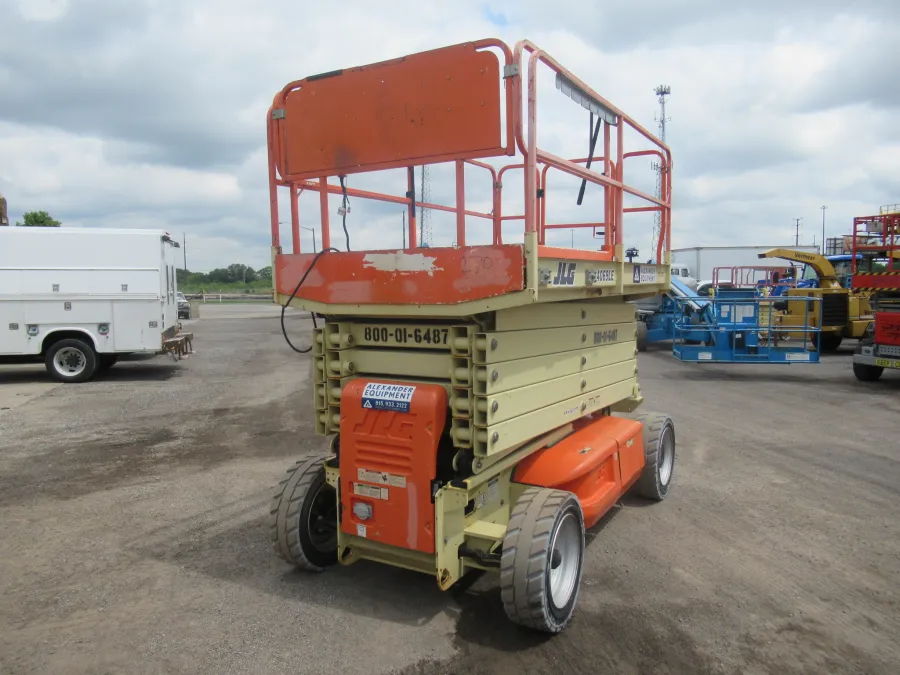 JLG 4069LE electric rough terrain scissor lift for sale. Features: 40′ platform height, 800 lb platform capacity, non marking tires and extension deck.
