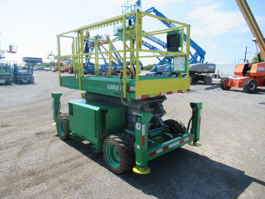 For sale, Skyjack SJ6832RT scissor lift. If you’re a John Deere or Green Bay Packers fan, this one’s for you! Features: 32′ platform height, outriggers, 4WD, 1000 lb platform capacity, extension deck and dual fuel.