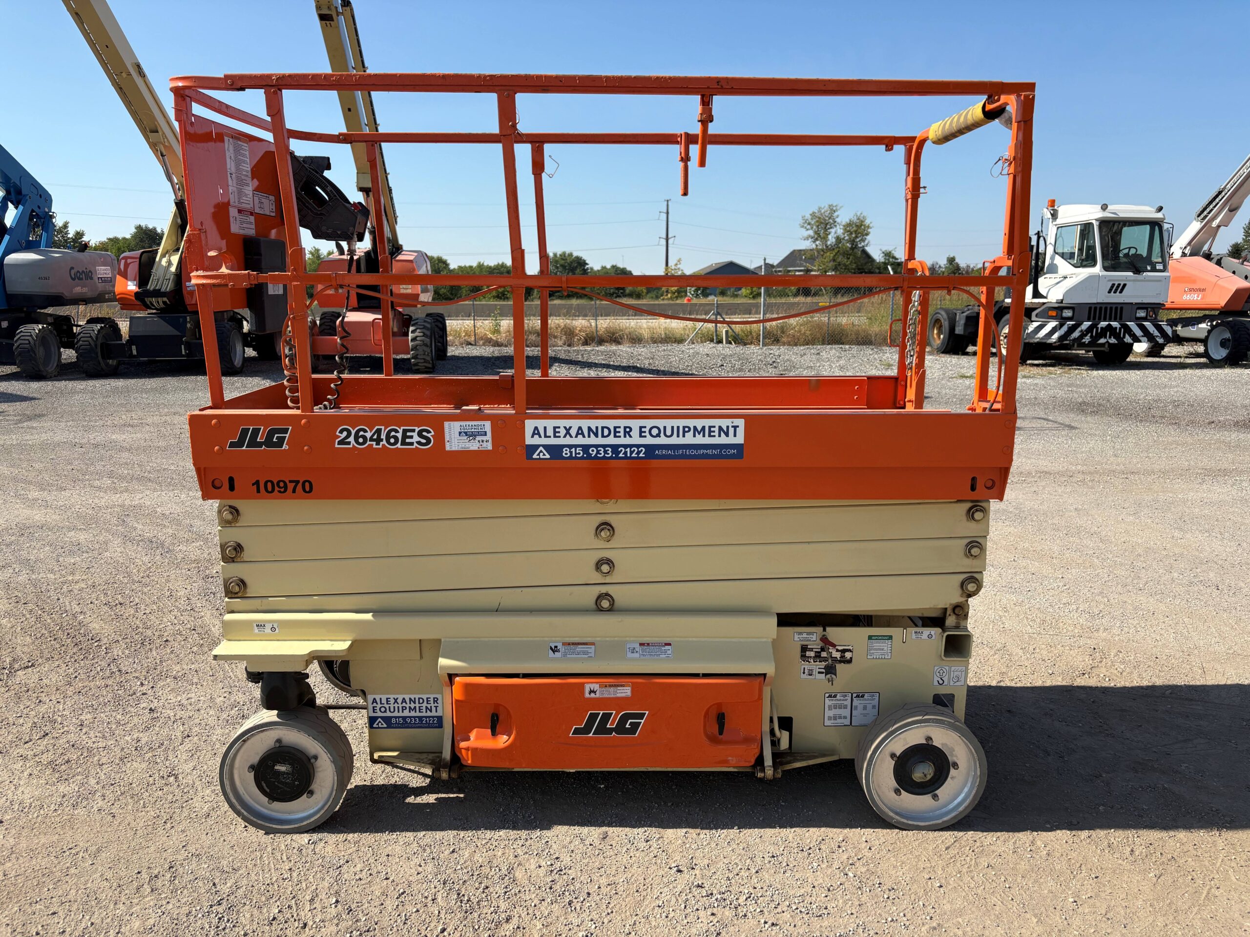 JLG 2646ES electric slab scissor lift for sale. Features: 26′ platform height, 1000 lb platform capacity, non marking tires and extension deck.