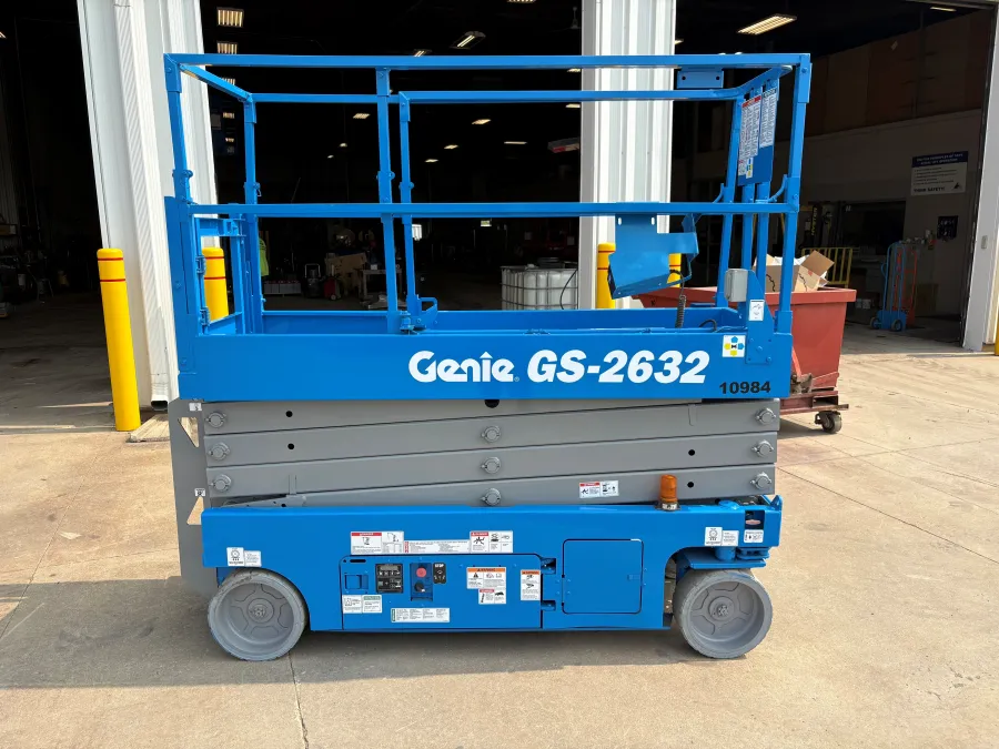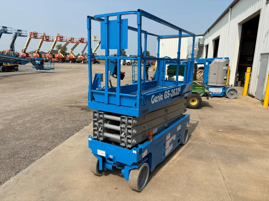 2012 Genie GS2632 electric scissor lift: 26′ platform height, 500lbs platform capacity, extension deck and non-marking tires.