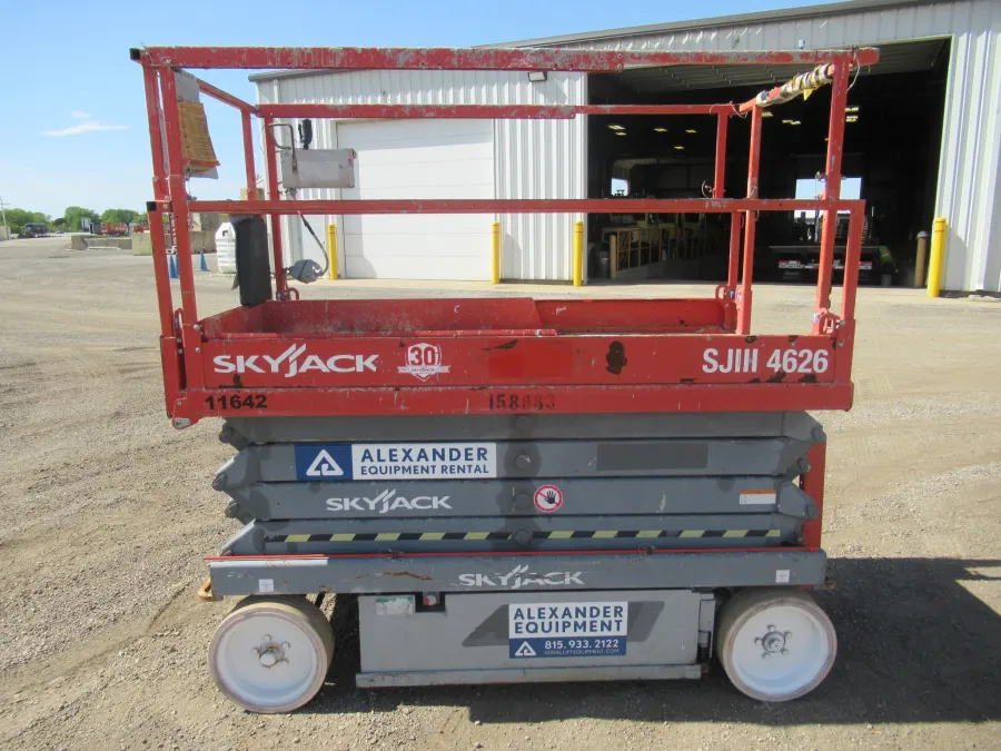 This Skyjack SJ4626 electric slab scissor lift is for sale. Features: 26′ platform height, non-marking tires and extension deck.