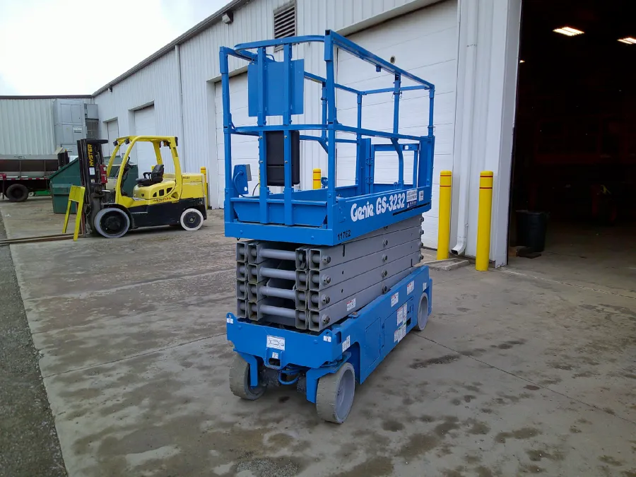 2017 Genie GS3232 electric scissor lift. Features: 32′ platform height, 500lbs platform capacity, extension deck and non-marking tires.