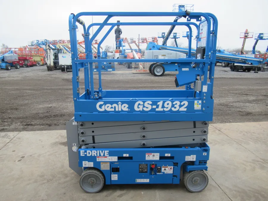 Brand new Genie GS1932 electric slab scissor lift for sale. Features: 19′ platform height, E-Drive, non-marking tires, and extension deck.