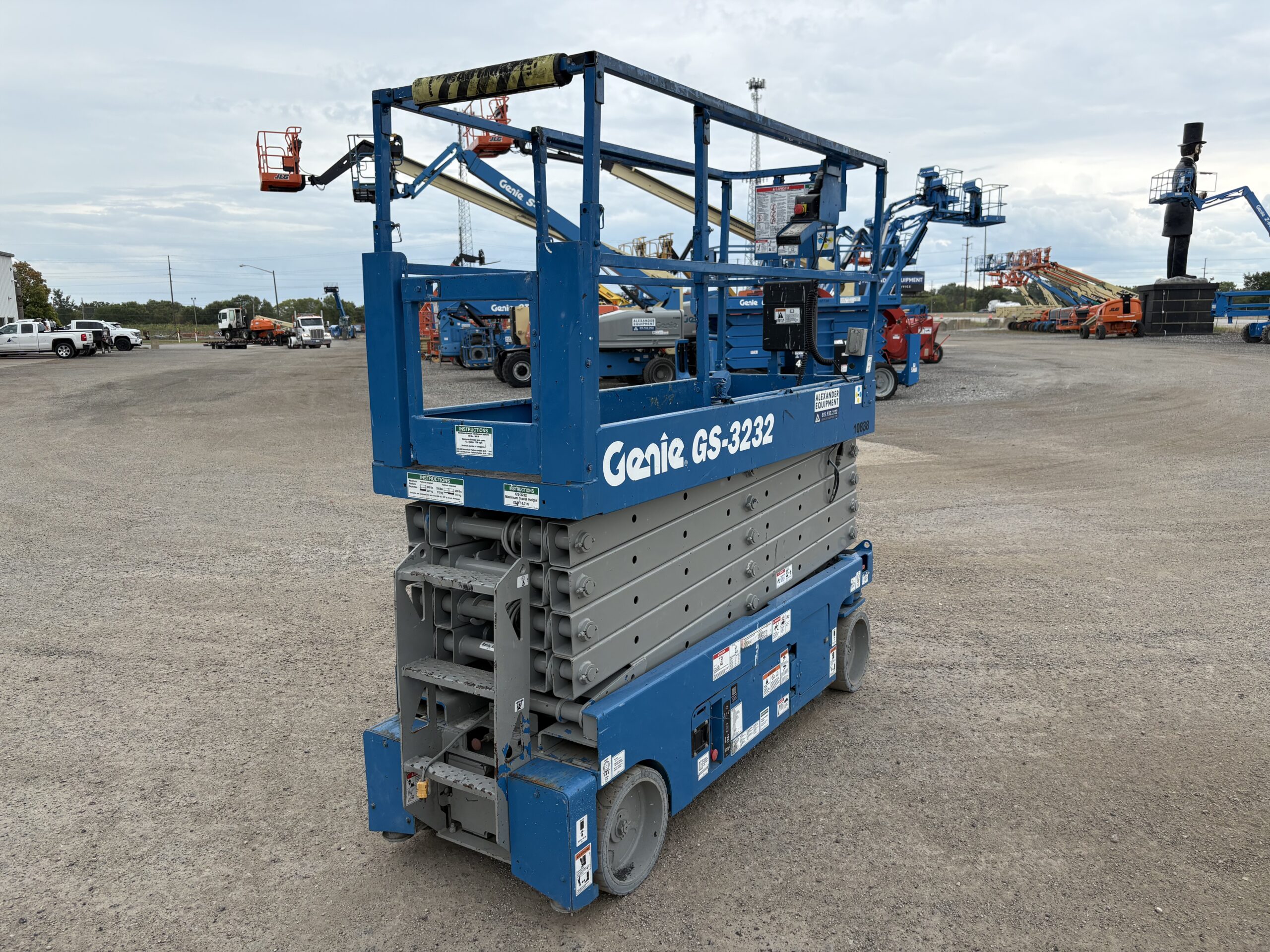 2011 Genie GS3232 electric scissor lift: 32′ platform height, 500lbs platform capacity, extension deck and non-marking tires.