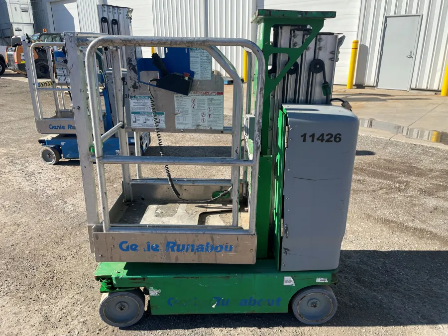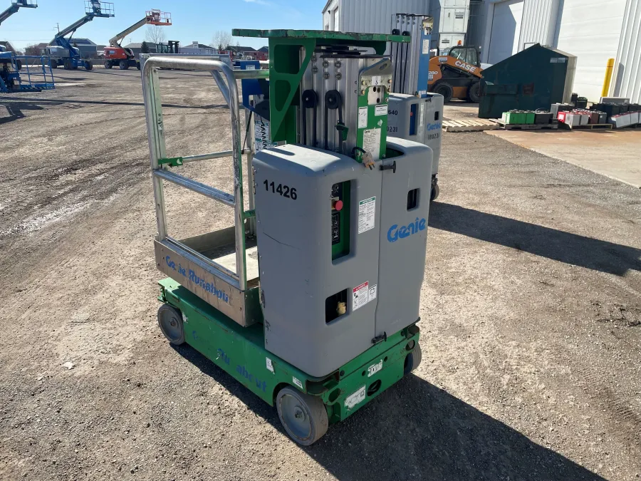 Genie GR-15 self-propelled vertical mast lift. Features include: 15′ platform height, extension deck and non-marking tires.