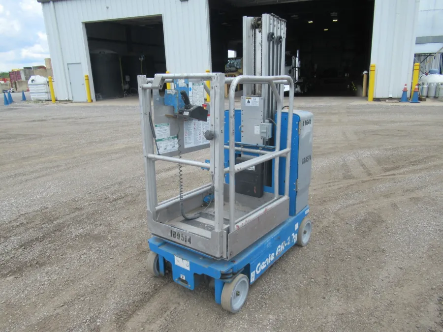 This Genie GR-20 self-propelled vertical mast lift is for sale. Features include: 20′ platform height, extension deck and non-marking tires.