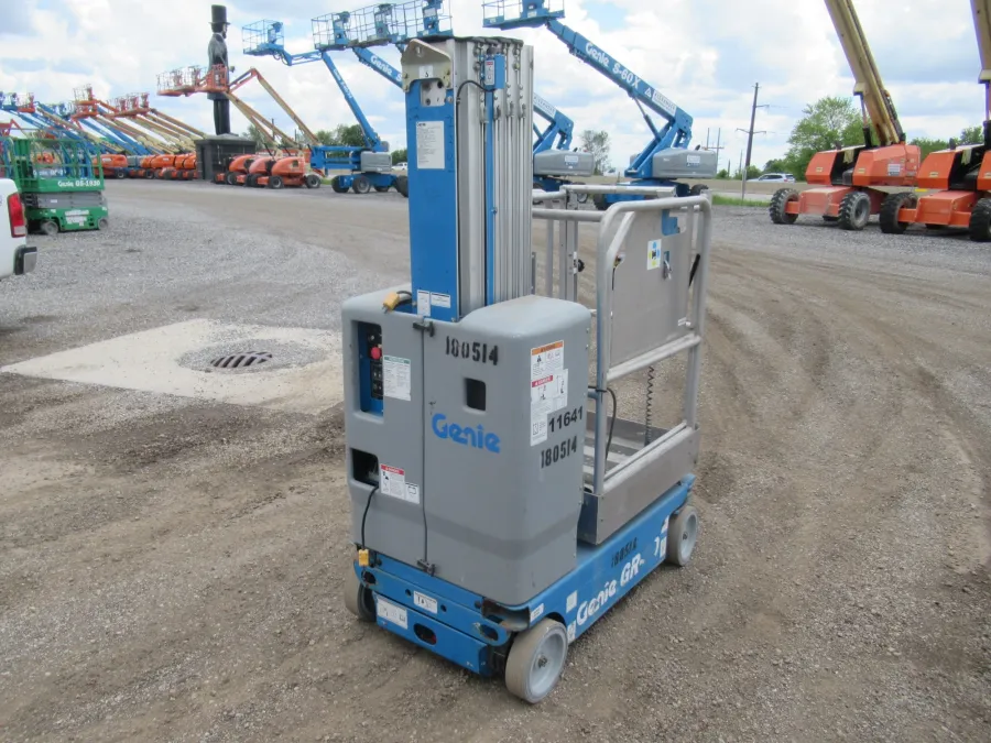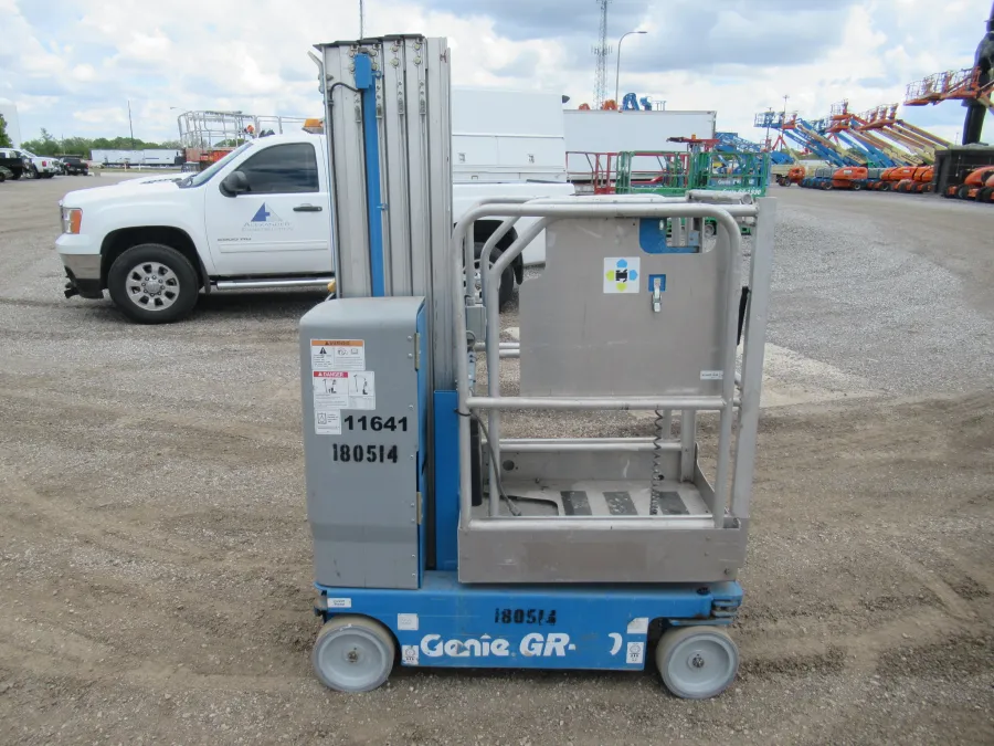 This Genie GR-20 self-propelled vertical mast lift is for sale. Features include: 20′ platform height, extension deck and non-marking tires.