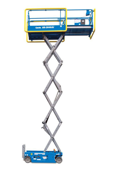 We offer Genie GS-2646 electric scissor lifts for rent. Features include 26 ft platform height, extension deck and non-marking tires.